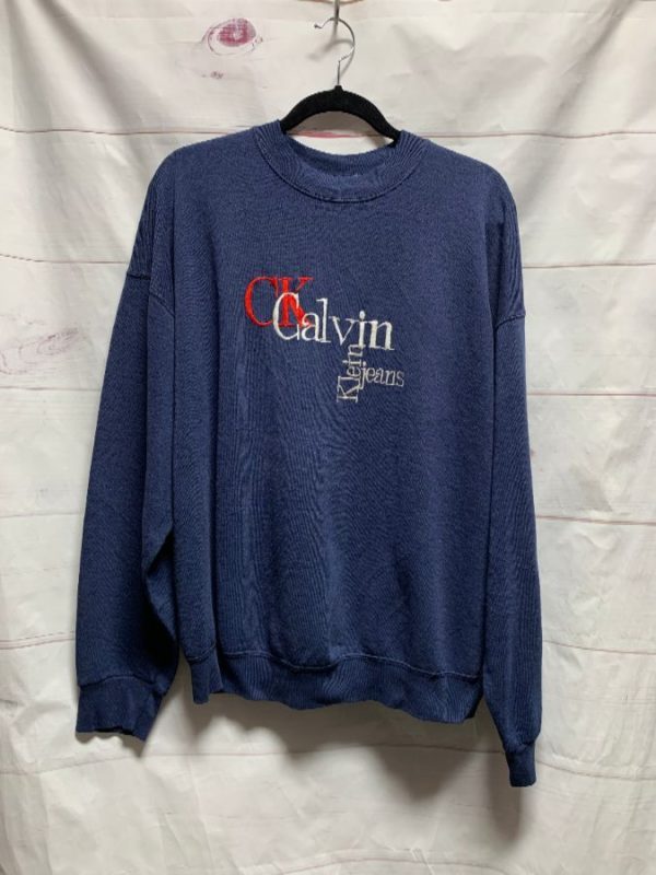 CALVIN KLIEN SWEATSHIRT, PULLOVER, CREW-NECK, EMBROIDERED FRONT LOGO, BLUE/RED/WHITE, SIZE XL