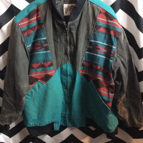 Jacket, zip-up, canvas, Aztec design panels, striped wool lining, teal/black/red/white, size XL