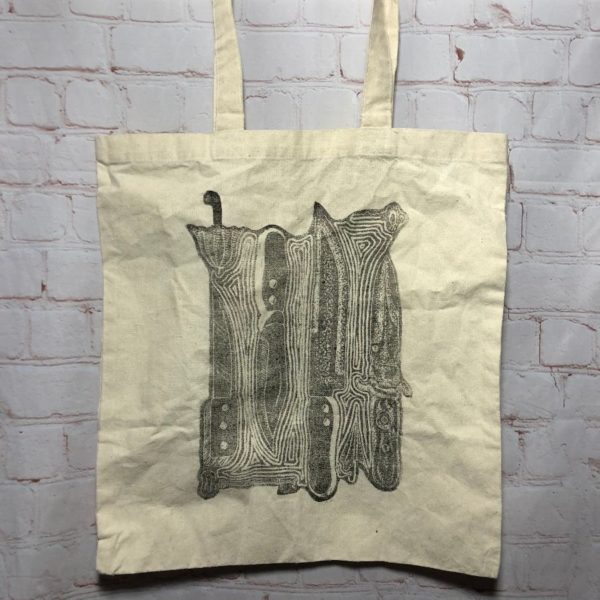 Tote bag, canvas, double handles, screen printed knives graphic design, off white/dark gray, size 14″W x 15″L