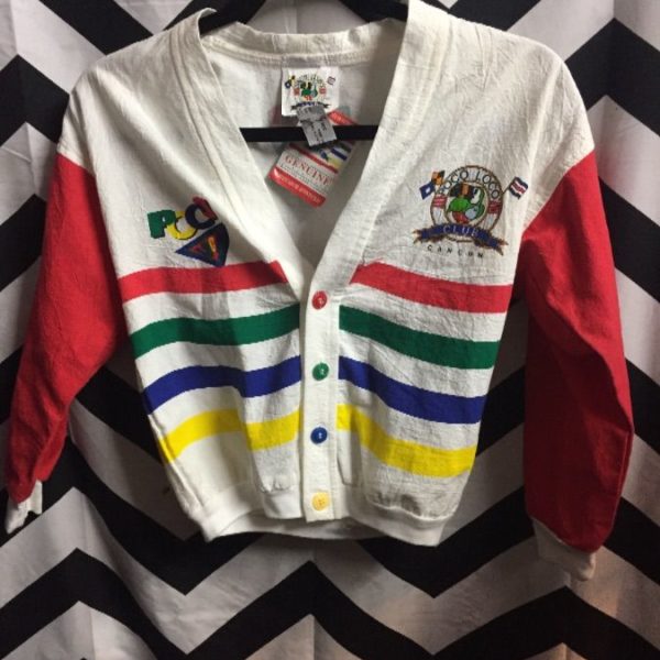 Cardigan, button-up, Poco, primary colors, screen printed designs front & back, new, white/red/green