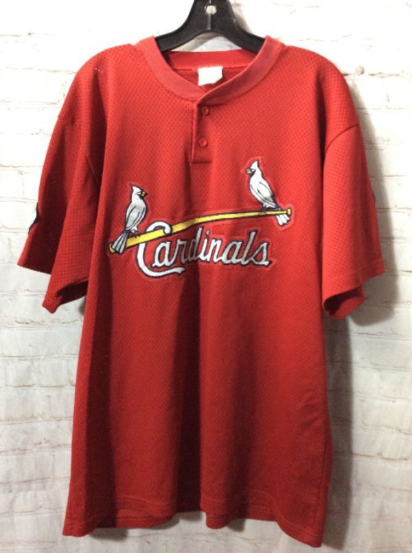 Baseball jersey, short sleeves, 1/4 button-up neck, St Louis Cardinals #12, team logo full front, number on back, embroidered arm patches, red/yellow/white/black, size XL