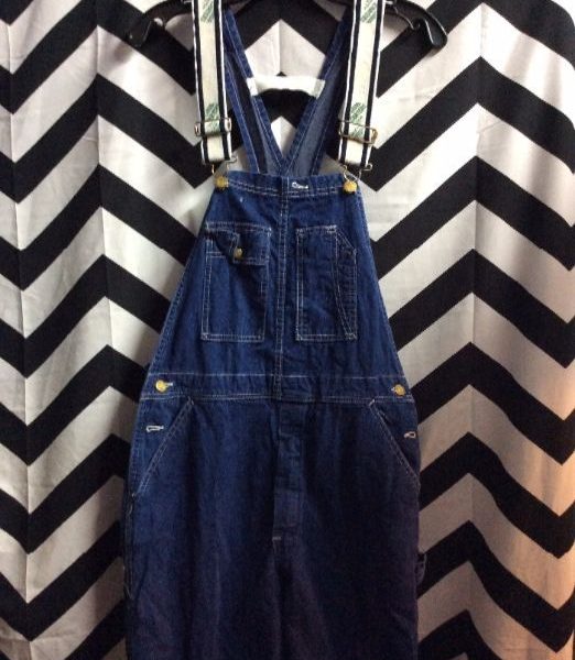 DARK BLUE DENIM OVERALLS W/ CONTRAST STITCH & BRASS WREATH BUTTONS