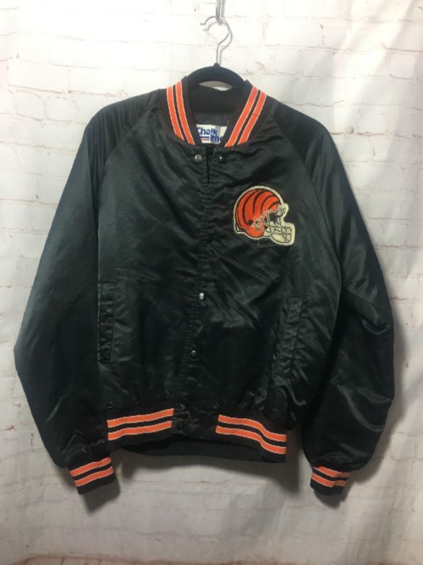 Chalk Line football jacket, satin, button-up with snaps, Detroit Tigers, striped trim on neck/cuffs/hem, 2 front pockets, embroidered helmet/team/NFL patches, black/orange, size M