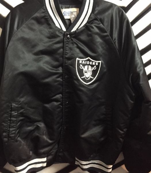Raiders satin jacket, Chalkline, button-up, with appliqued letters on back, embroidered design on front left chest, black/white, size M as-is