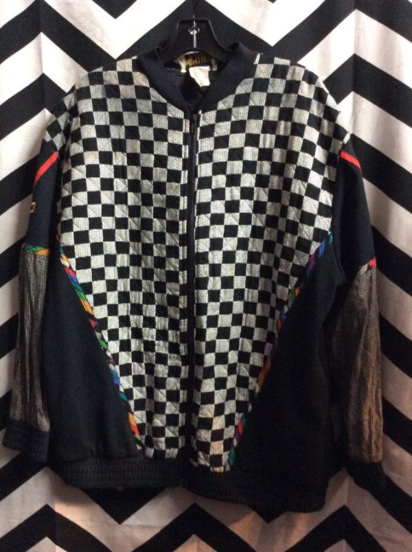 Windbreaker jacket, zip-up, cotton, checkered pattern, color block design, black/white, size L