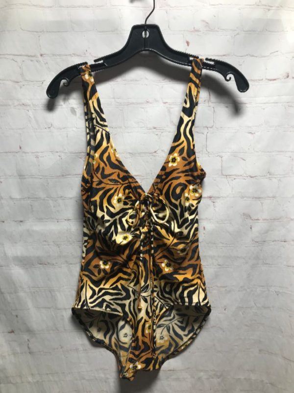 Lady Gottex swimsuit, one piece, jungle/cheetah and tiny flowers print, lace-up front, brown/orange/black/white/yellow, size M/L As is