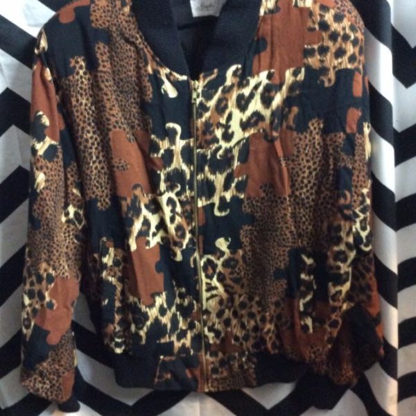 Bomber jacket, zip-up, cheetah puzzle print, contrasting collar/cuffs/bottom, black/brown/white, size L