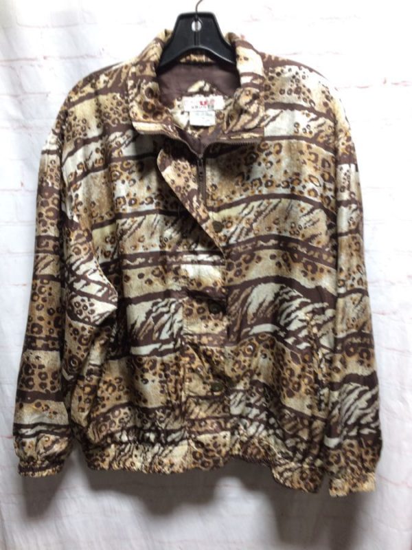 STUNT SPORTS BOMBER JACKET, 100% SILK, ZIP-UP/BUTTON-UP, LINED, HORIZONTAL STRIPES WITH CHEETAH/ZEBRA PATTERN DESIGN, WHITE/TAN/BROWN/BEIGE, SIZE M
