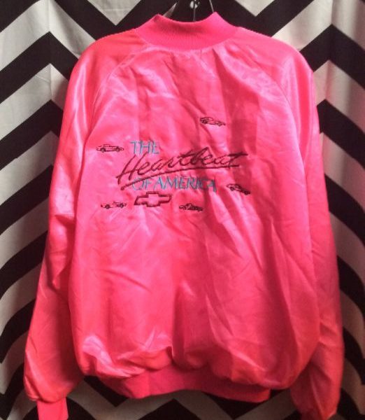 Baseball style jacket, satin, Chevy, Heartbeat Of America, embroidered lettering, hot pink, size XL