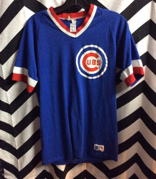 Baseball jersey, Chicago Cubs, screen printed logo left chest, striped arms and neck, blue/red/white, size L