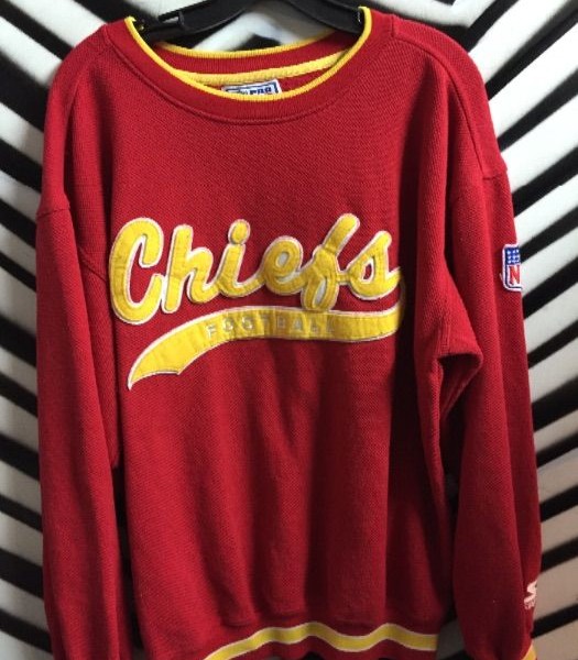 Chiefs pullover sweatshirt, Starter, embroidered/applique with NFL patch, red shirt with yellow stripes and lettering, size L