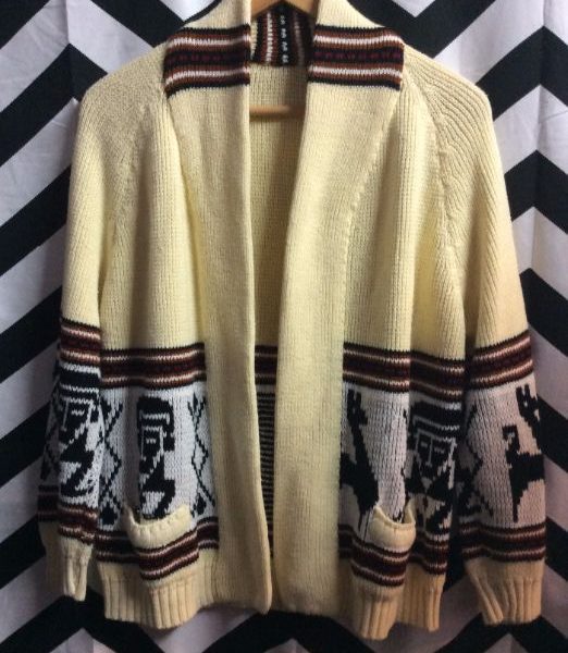 Cardigan sweater, chunky knit, Cowichan design, creme/dark brown