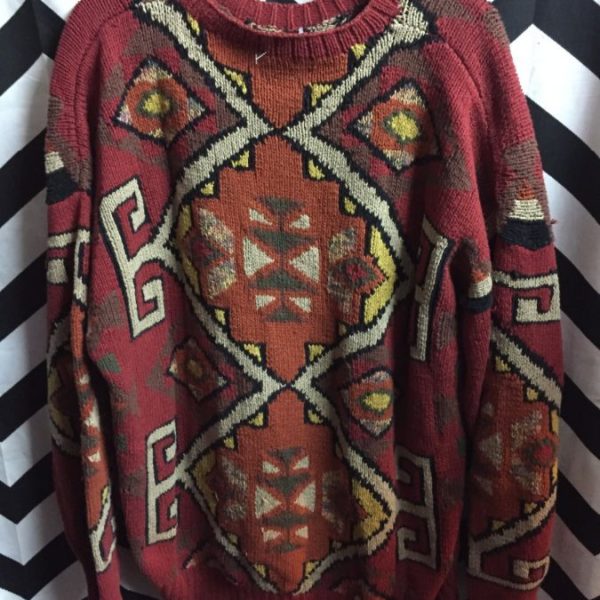 CHUNKY KNIT PULLOVER SWEATER W/BOLD SOUTHWEST DESIGN