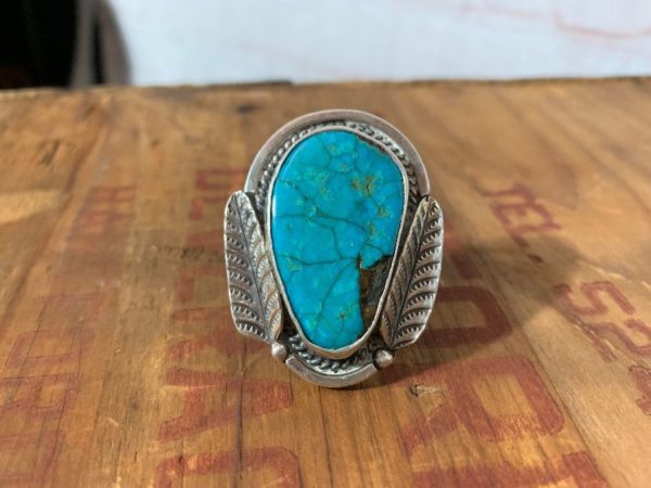 Ring, chunky turquoise Southwestern style, set in feather/leaf design sterling silver setting, silver/turquoise, size 7.5 As is