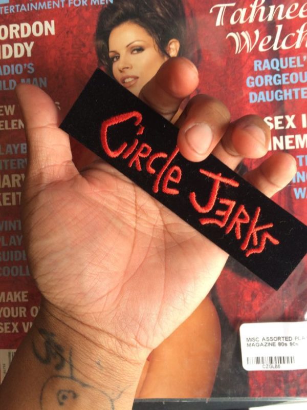 Embroidered patch, rectangular shaped, classic Circle Jerk in scribble font lettering, black/red