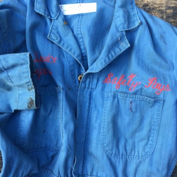 Work jumpsuit, snap-up, City Service Company, Safety Pays, embroidered lettering, blue/red, size M
