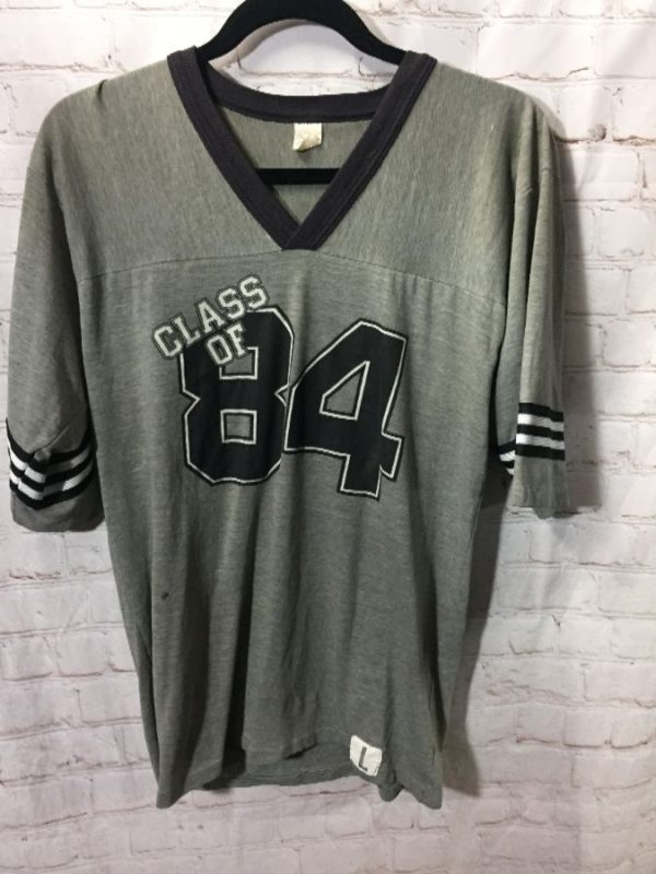 Class Of ’84, contrasting trim around neck, horizontal stripes on sleeves, gray/white/black