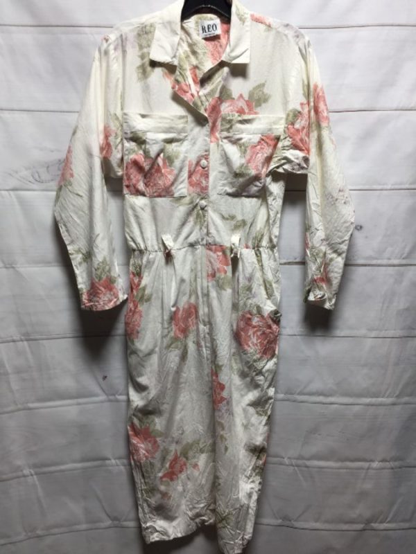 1980’s classic R.E.O. dress, cotton, long sleeves, button-up, collar, floral print, front chest pockets, belt loops, white/pink/purple/green, size 12