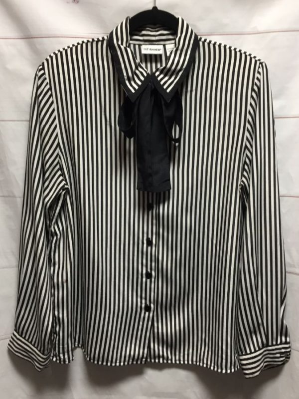 CLASSIC LIZ BAKER SHIRT, POLYESTER, LONG SLEEVES, BUTTON-UP, COLLAR, SHOULDER PADS, ASCOT AROUND NECK, VERTICAL STRIPED PRINT, WHITE/BLACK, SIZE 12