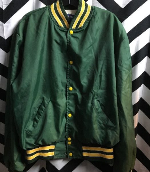 Classic baseball style jacket, button-up, striped neck and sleeves, green/yellow, size XL