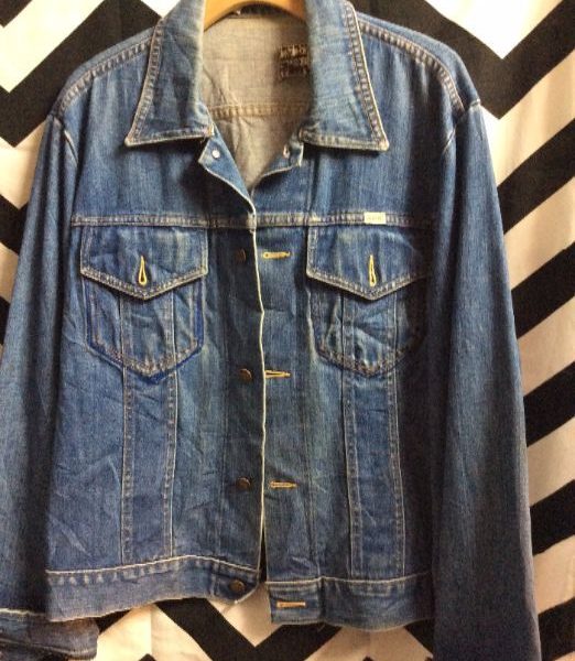 Classic denim jacket, button-up, soft fabric, blue, size L