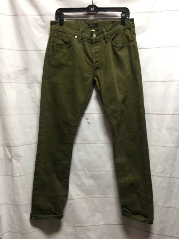 CLASSIC DOUBLE RL BY RALPH LAUREN DENIM JEANS, ZIP-UP, TAPERED LEG, SELVEDGE HEM, OLIVE GREEN, SIZE 34