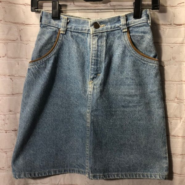 CLASSIC DENIM SKIRT W/ LEATHER PIPING & LIGHT WASH