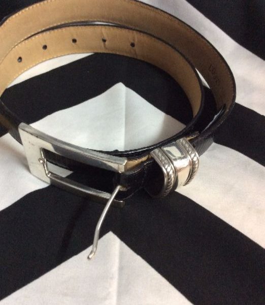 POLISHED LEATHER EMBOSSED DESIGN NARROW CUT LEATHER BELT SILVER SQUARED BUCKLE