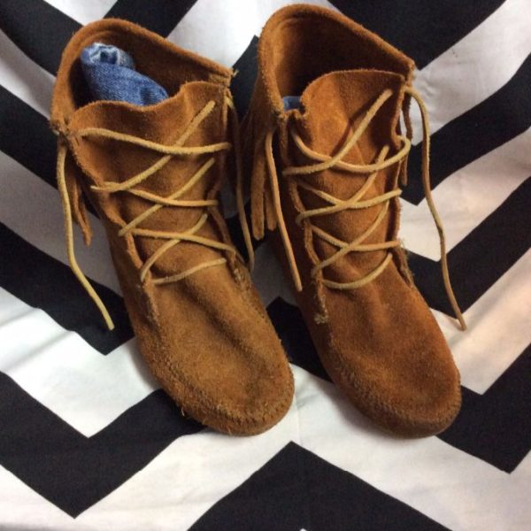 CLASSIC MINNETONKA MOCCASINS – LEATHER/SUEDE – MID HEIGHT – FRINGE AROUND TOP