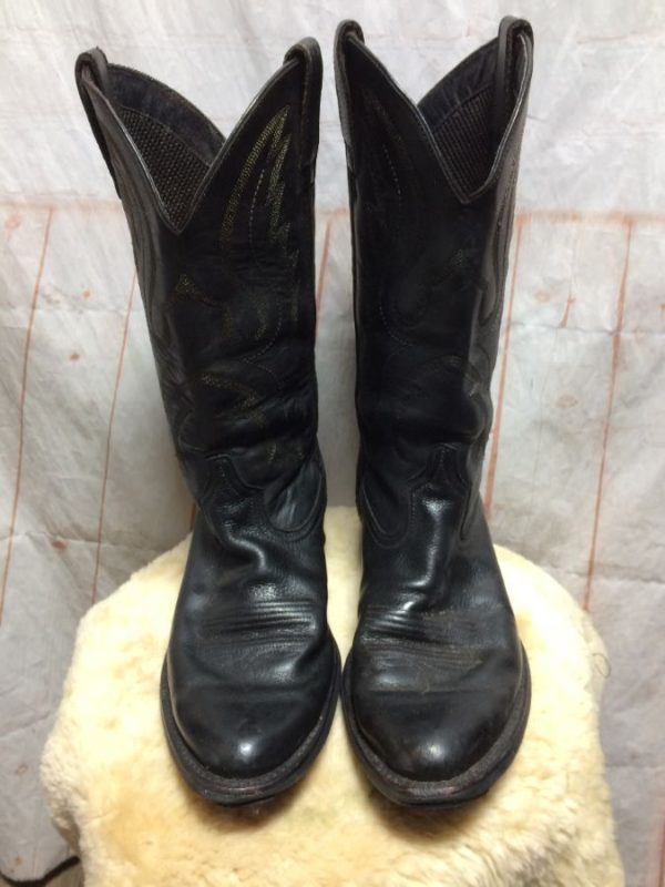 Classic Ariat Cowboy boots, oiled leather, high tops, embossed logo above heel, decorative stitching on tops, brownish black, size 10.5