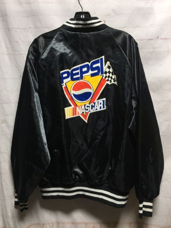 Classic Pepsi bomber jacket, satin, baseball style, snap-up, Nascar edition, screen printed small front logo & full back graphic, black/red/white/blue/yellow, size XL