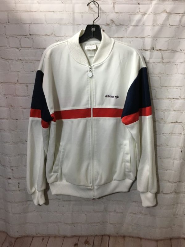 Classic retro Adidas jacket, track style, zip-up, left chest logo, center horizontal stripe across body & sleeves, 3 color sleeves, color block design, white/red/navy, size M. As is