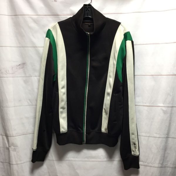 CLASSIC RETRO BEN SHERMAN JACKET, TRACKSUIT STYLE, ZIP-UP, SLEEVE LOGO, KNITTED COLLAR/CUFFS/HEM, VERTICAL STRIPED COLOR BLOCK DESIGN, BLACK/WHITE/GREEN, SIZE L
