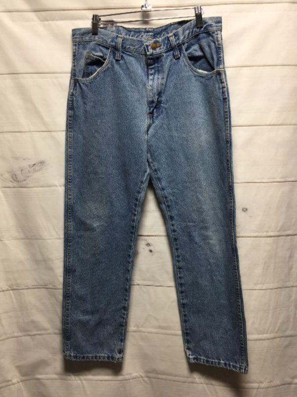 Classic retro Rustler denim jeans, zip-up, acid washed, medium blue, size 32W As is