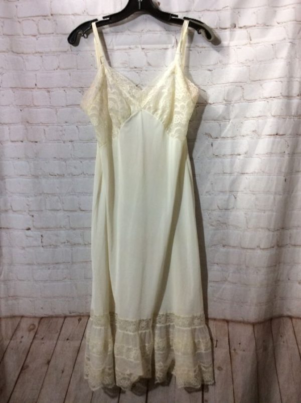 Classic slip/dress, sheer, spaghetti straps, lace trim top & around bottom, creme, size M
