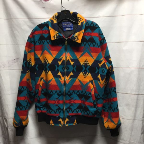 CLASSIC WOOL PENDLETON ZIPUP BOMBER STYLE JACKET WITH BRIGHT AZTEC TRIBAL DESIGN