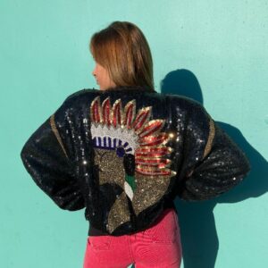 STUNNING & RARE 1980S-90S FULLY SEQUINED & BEADED NATIVE HEADDRESS DESIGN ZIP UP BOMBER JACKET SILK LINED