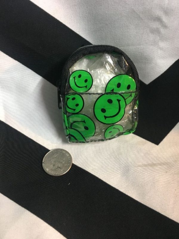 Keychain, coin purse, mini backpack style, zip closure, smiley faces design, clear/green/black