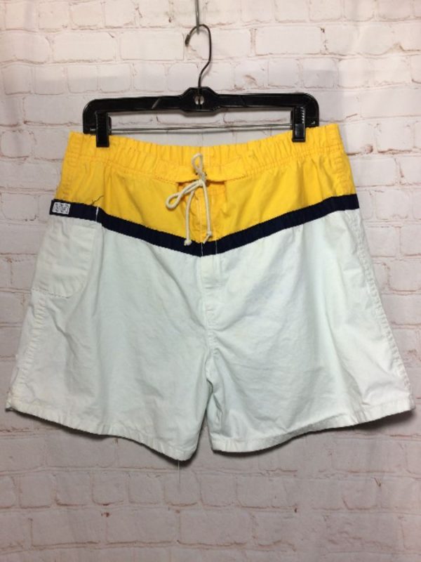 Brittania swim trunks, cotton, elastic waist, drawstring, wide & thin upper vertical stripes, color-block design, white/yellow/black, size 34