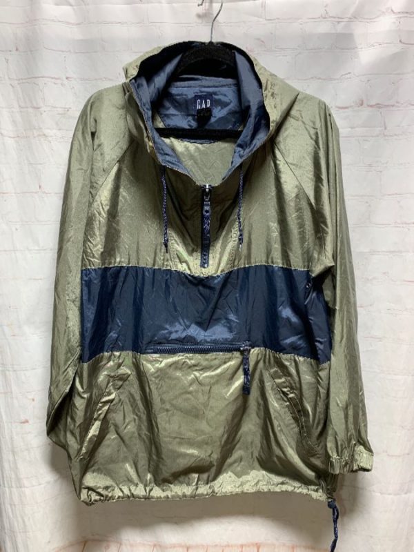 Gap windbreaker jacket, pullover, 1/2 zip-up neck, hooded, horizontal stripe color-block design, GAP screen printed across back stripe, zippered front pouch pocket, olive green/navy blue/white/gray blue, size M