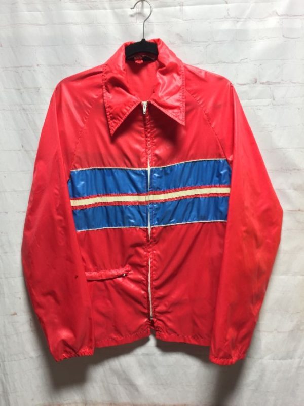 Briarcliff windbreaker jacket, zip-up, folds into back pouch/pocket, horizontal stripes in color-block design, red/white/blue, size M As is