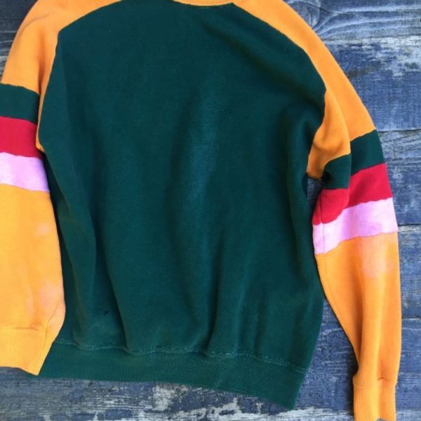 Pullover sweatshirt, color-block sleeve design, stripes on sleeves, yellow/green/pink/red, size M