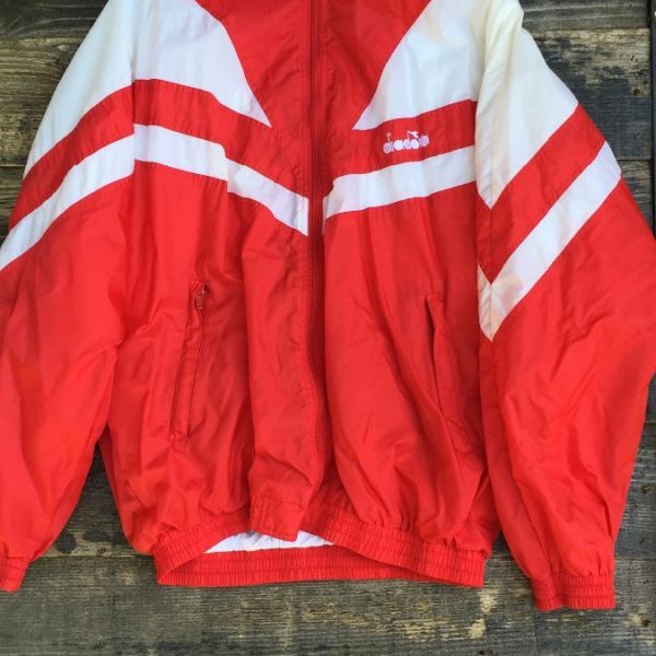 Diadora windbreaker jacket, zip-up, hideaway hood, color-block design, logo left chest, red/white, size L