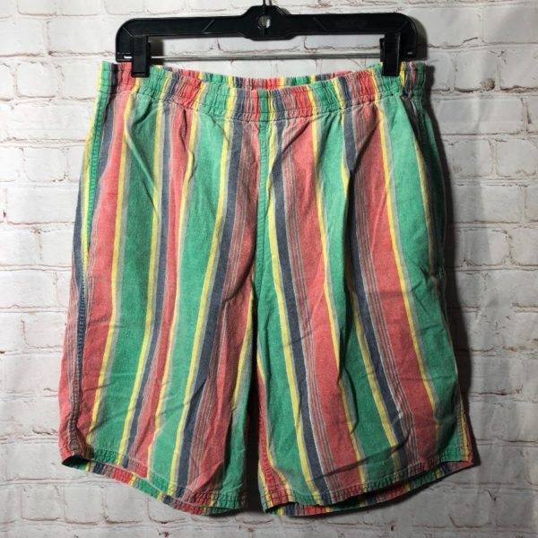 Shorts, cotton, elastic waist with drawstring, colorful, vertical striped print, back pocket, pink/yellow/green/blue/purple, size M