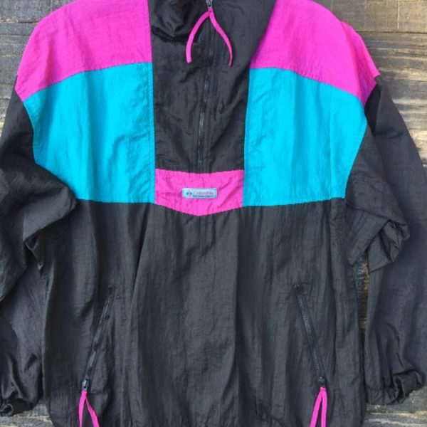 Columbia windbreaker jacket, 1/2 zip-up, color-block design, front logo patch, teal/black/purple, size M