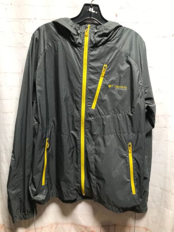 Columbia Titanium windbreaker jacket, zip-up & zippered pockets in contrasting color, hooded, screen printed logo small front chest logo, gray/yellow/white, size L As is