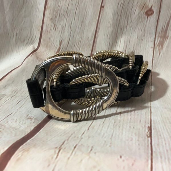 Brighton belt, faux snake skin leather, silver metal oval shaped buckle & decorative oval links with angled lines design and hour-glass inside connected with leather straps, black/silver, size 32W