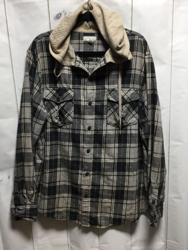 Utility 1990’s flannel shirt, long sleeve, button-up, solid colored hood, plaid print, button-up front pockets, cool, gray/black/blue, size XL
