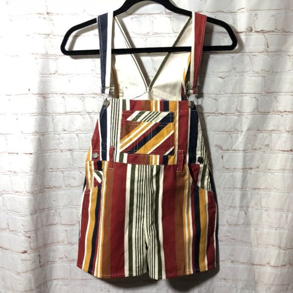 EARTH TONED MULTI-STRIPED OVERALL SHORTS W/ SKINNY STRAPS & METAL BUTTONS