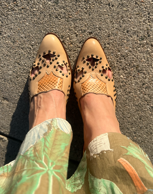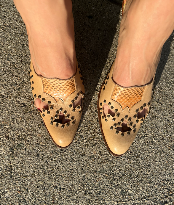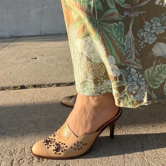 COOL! Y2K STUDDED & CUTOUT LEATHER HEELED MULES, SNAKESKIN PANELS